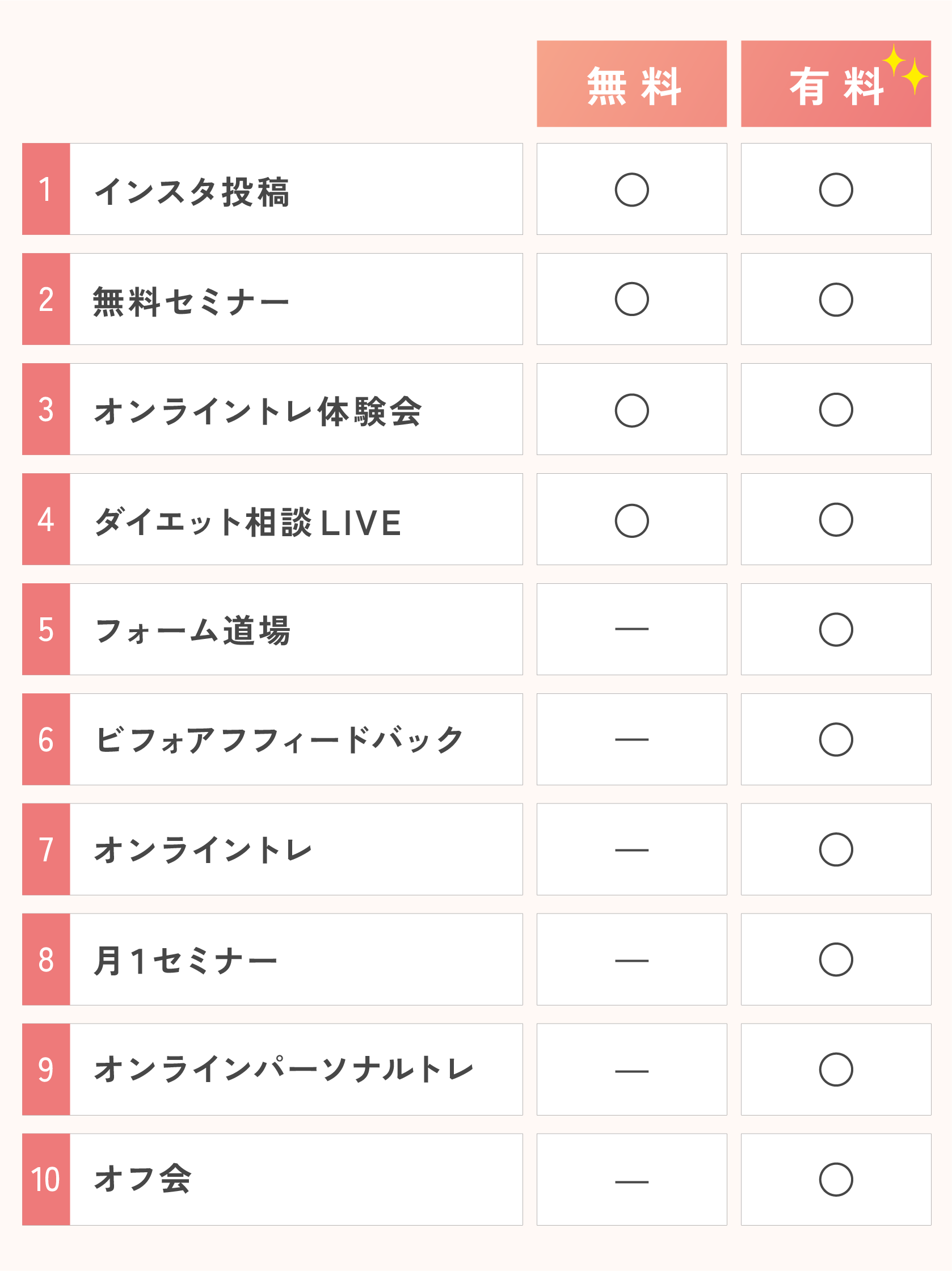 今後は、必要なサービスだけをスポットで受けられるから、忙しい日常でもムリなく取り組めます。さらに、無料でダイエットやボディメイクの基礎から学べる情報提供や、定期的なライブ相談会など、あなたの悩みに寄り添う仕組みを充実させました🥺❤️🔥